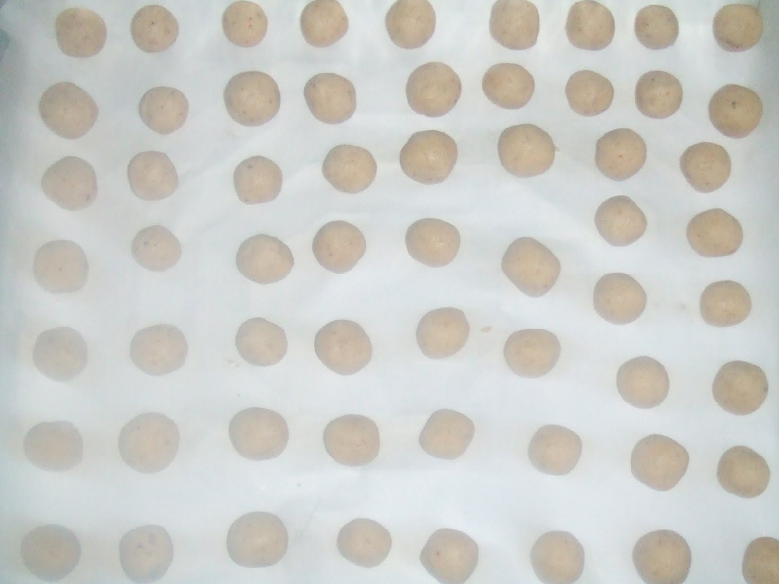 Se formeaza mici bilute pe care le-am pus in tava cu hartie de copt. Pentru ca prajiturelele sa iasa cu succes, trebuie pusa tava in frigider pentru o ora si jumatate.Eu le-am acoperit cu pelicola alimentare. Se coc in cuptorul preincalzit la 160 grade pentru circa 15 minute.Eu le-am cam "bronzat":).